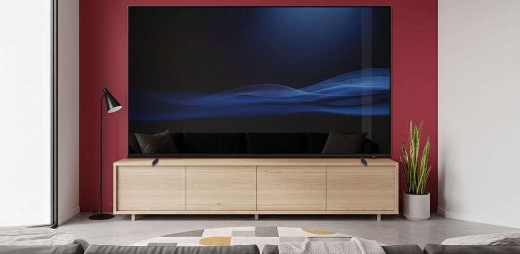 Samsung setzt mit seinem neuen Spitzenmodell in Sachen Materialqualität und Verarbeitung mal wieider Maßstäbe. Das Gehäuse sowie die Standfüße sind aus echtem Metall gefertigt. Trotz seiner beeindruckenden Bilddiagonale bleibt der Fernseher mit einer Bautiefe von nur 3,4 Zentimetern bemerkenswert schlank. Das macht ihn besonders attraktiv für die Wandmontage. Dabei kann entweder eine herkömmliche VESA-Wandhalterung im Format 1000 x 600 mm verwendet werden oder Samsungs spezielle Slim-Fit-Wandhalterung, die den Fernseher nahezu bündig an die Wand anschmiegt. Diese elegante Lösung lässt das Gerät fast wie ein Kunstobjekt wirken und fügt sich harmonisch in jede Wohnumgebung ein.