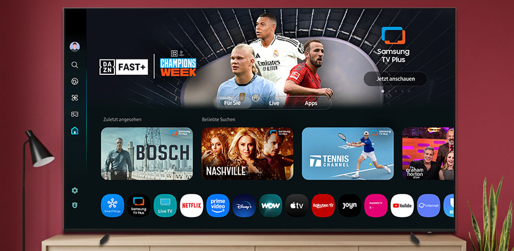 Das Samsung GQ115QN90F präsentiert sich als echtes 4K-Spitzenmodell, das in Sachen Ausstattung keine Kompromisse eingeht. Angetrieben vom bewährten Tizen-Betriebssystem überzeugt der Fernseher mit einer eleganten, übersichtlichen Oberfläche und einer beeindruckenden Auswahl an Streaming-Apps wie Amazon Prime Video, Disney+, Apple TV+, Rakuten TV, Joyn und FIFA+. Die Bedienung gelingt dank schneller Menü- und App-Startzeiten äußerst flüssig. Neben der klassischen Fernbedienung bietet Samsung auch Sprachsteuerung via Alexa und Bixby sowie eine Gestensteuerung, die allerdings eine Samsung Galaxy Smartwatch der 7. Generation voraussetzt. Die Fernbedienung selbst punktet mit einer innovativen Solar- und USB-C-Ladefunktion, wodurch lästige Batteriewechsel entfallen.